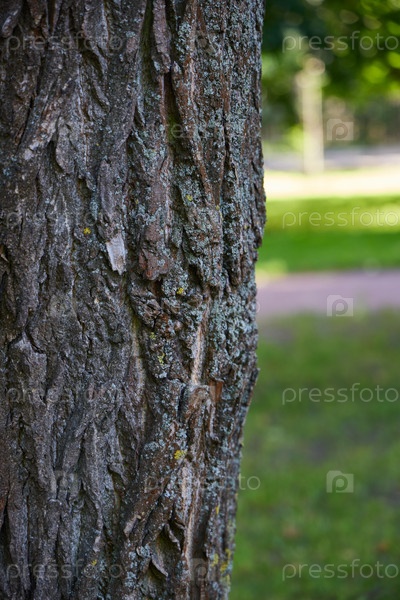 Фотография коры дерева крупным планом в прекрасно освещенном солнцем парке, демонстрирующая природные элементы
