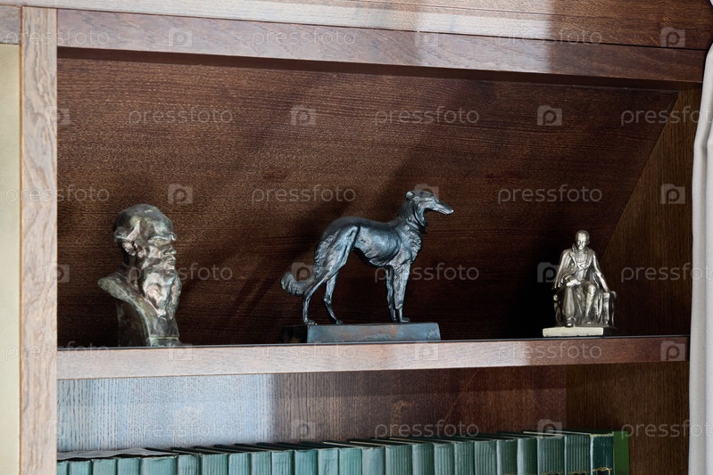 Элегантная художественная полка с красивыми статуями и подборкой книг