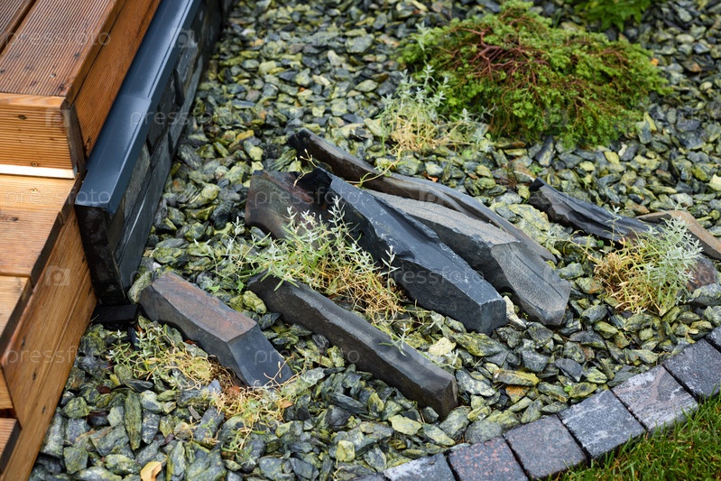 Элегантный ландшафт с прекрасно расположенными природными камнями и гравийными элементами