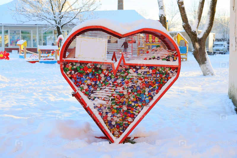 Яркая и красочная скульптура сердца возвышается на заснеженной игровой площадке