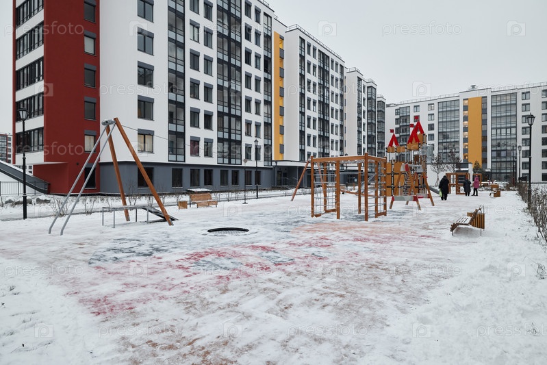 Яркая сцена зимней игровой площадки с красивым снегом и современными апартаментами