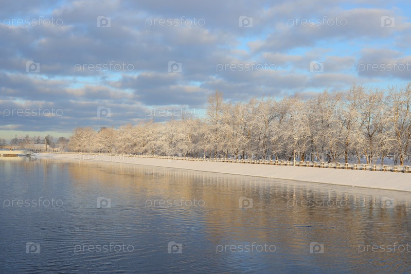 Спокойный зимний пейзаж с покрытыми инеем деревьями и спокойной, чистой рекой, текущей медленно