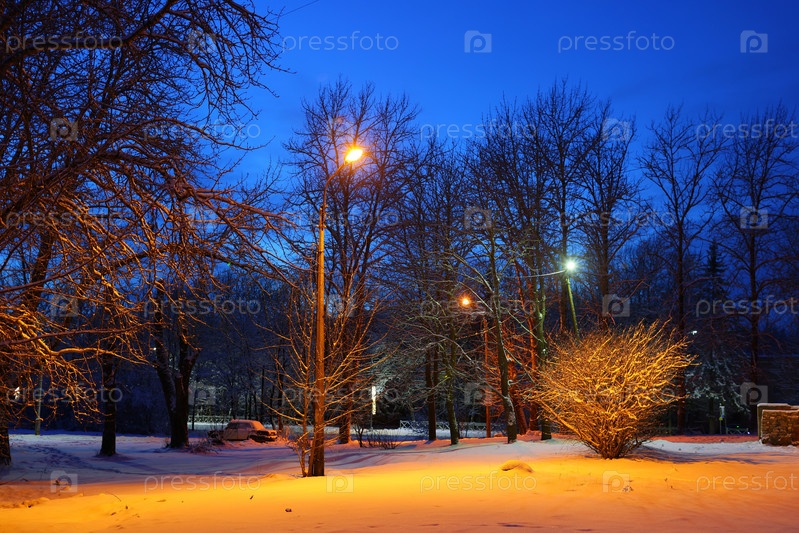 Спокойный зимний ночной парк, украшенный сверкающим снегом и теплыми уличными фонарями