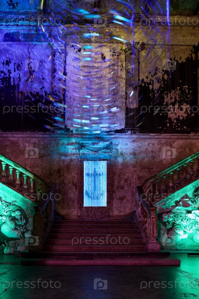 Освещенная лестница с художественным светом и якорем, создающая привлекательную атмосферу