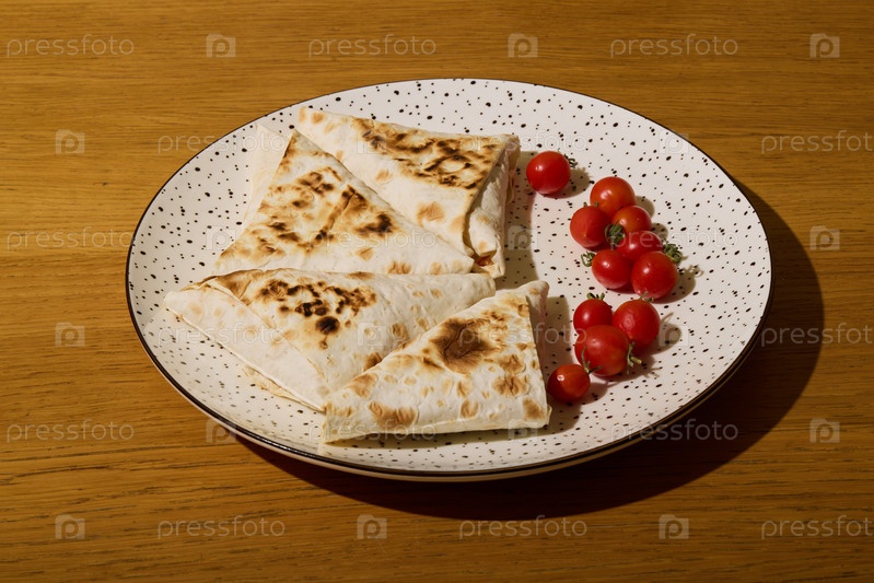 Тарелка, наполненная вкуснейшими жареными лепешками, украшенными яркими помидорами черри