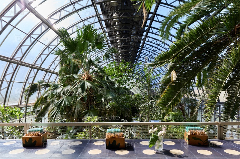 Пышная оранжерея, полная ярких тропических растений и солнечного света, льющегося внутрь