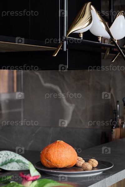 Стильный декор кухни с красивой экспозицией тыкв и других декоративных элементов
