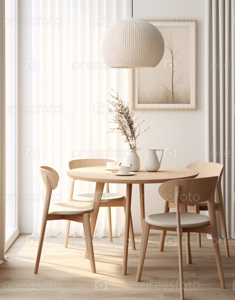 Роскошные апартаменты, комфортабельный люкс, гостиная. Макет постера, круглый стол и стулья в современной столовой