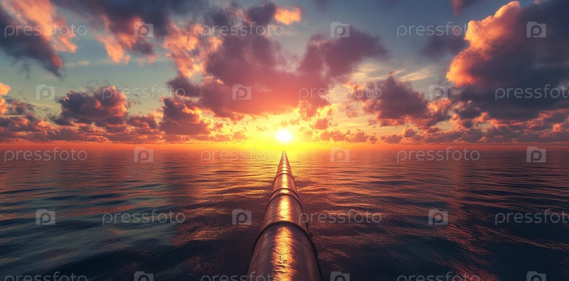 Солнце садится над спокойным водным путем, отражая золотистый свет на трубопроводе, тянущемся к горизонту