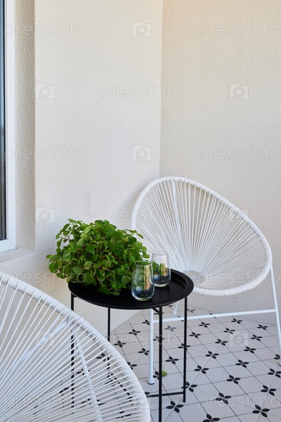 Стильный балкон с современными креслами, окруженный красивой зеленью и растениями