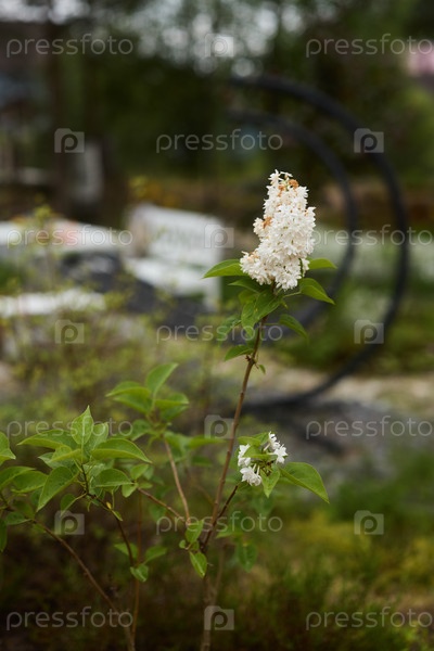 Белый цветок в прекрасном саду с различными декоративными элементами и атрибутами