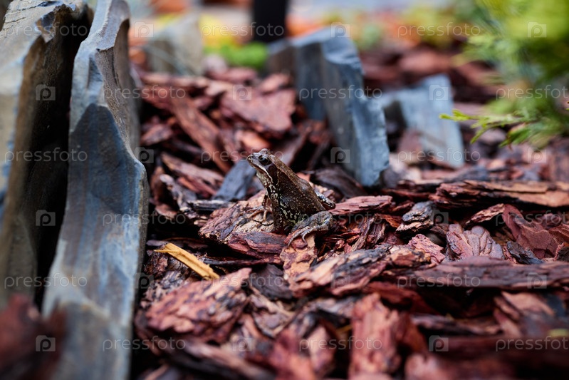 Лягушка, искусно замаскированная среди садовой мульчи, гальки и различных камней, найдена там