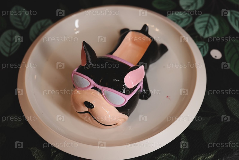 Фигурка игривой собаки в солнцезащитных очках, помещенная на декоративную тарелку для демонстрации