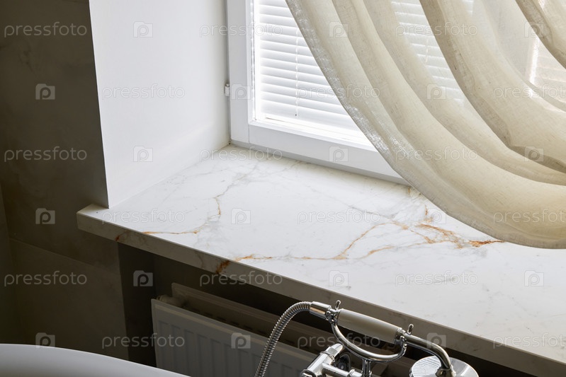 Элегантное окно в ванной с мраморным подоконником и мягкой драпировкой, способствующее релаксации