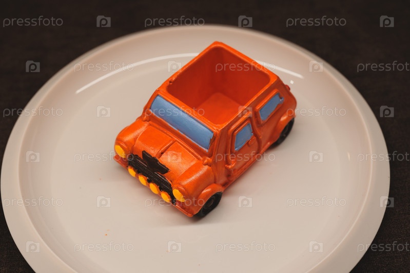 Яркая и красочная игрушечная машинка, разложенная на впечатляющей тарелке, готовая к показу