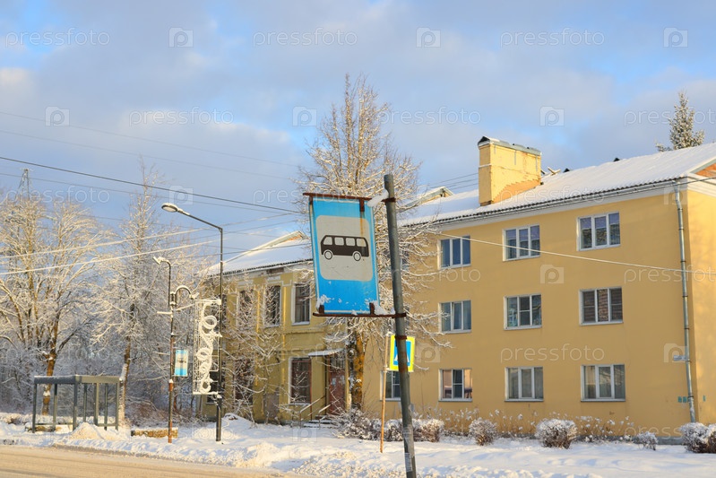 Зимний пейзаж с заснеженным желтым зданием, уличными знаками и уникальной архитектурой