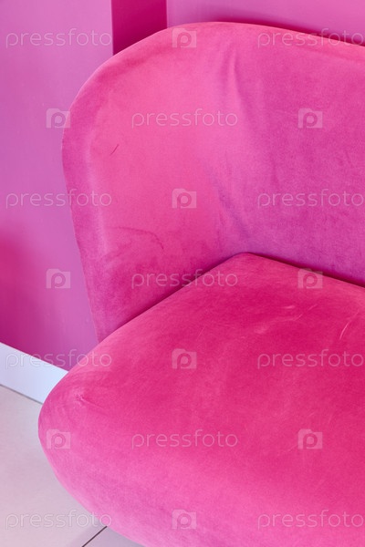 Яркое розовое кресло с обивкой, красиво расположенное на фоне ярко-розовой стены