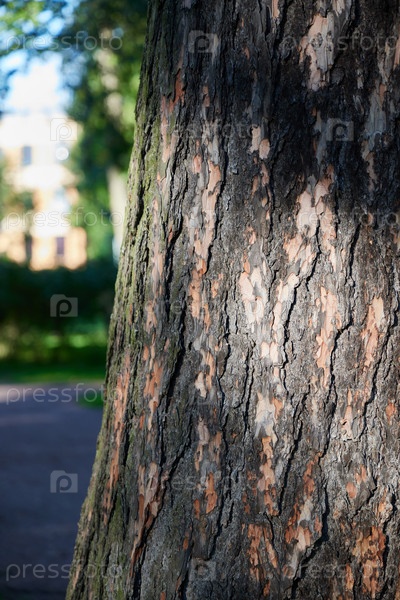 Великолепно детализированный крупный план текстурированной коры дерева, изысканно освещенной естественным светом