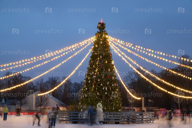 Великолепный праздничный каток, украшенный красивой рождественской елкой и сверкающими огнями