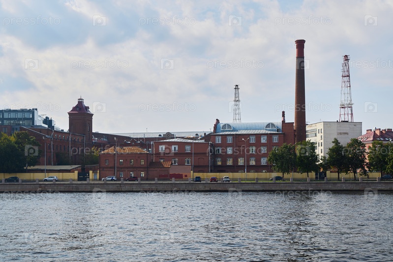 Живописный промышленный пейзаж, расположенный на берегу реки, с историческими кирпичными зданиями