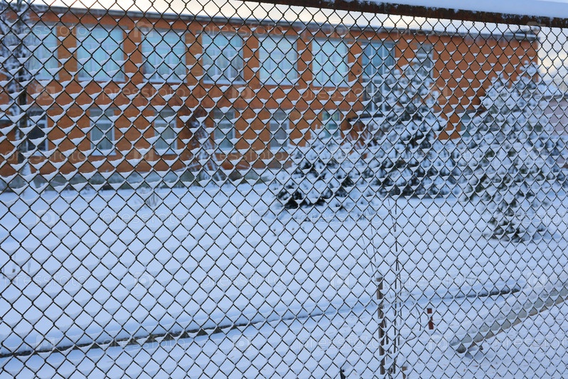 За деревенским забором открывается безмятежный зимний пейзаж, демонстрирующий заснеженный, умиротворяющий пейзаж