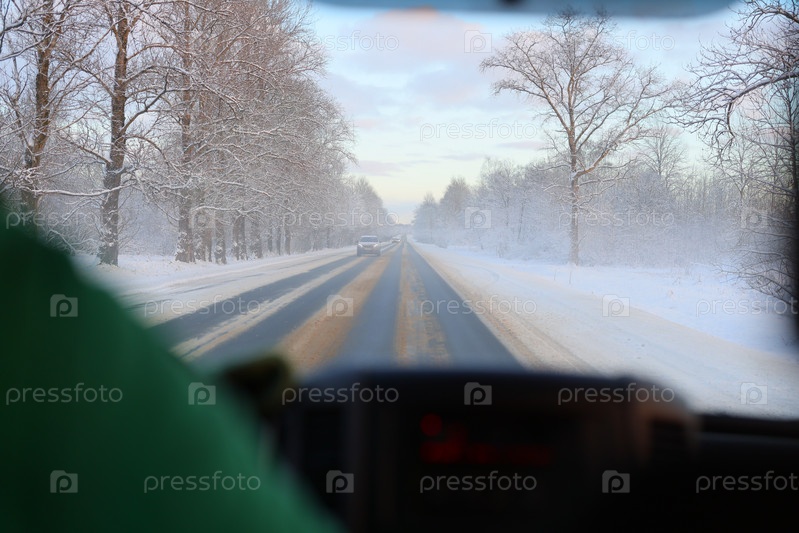 Наслаждайтесь зимней поездкой по заснеженной дороге с живописными деревьями, идеально подходящей для искателей приключений