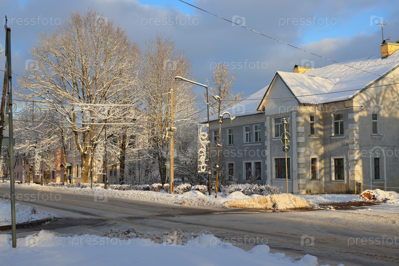 Красивый зимний пейзаж с заснеженными деревьями и зданиями под ясным небом