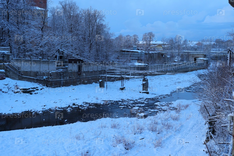 Потрясающий зимний пейзаж с заснеженной рекой, создающий атмосферу умиротворения