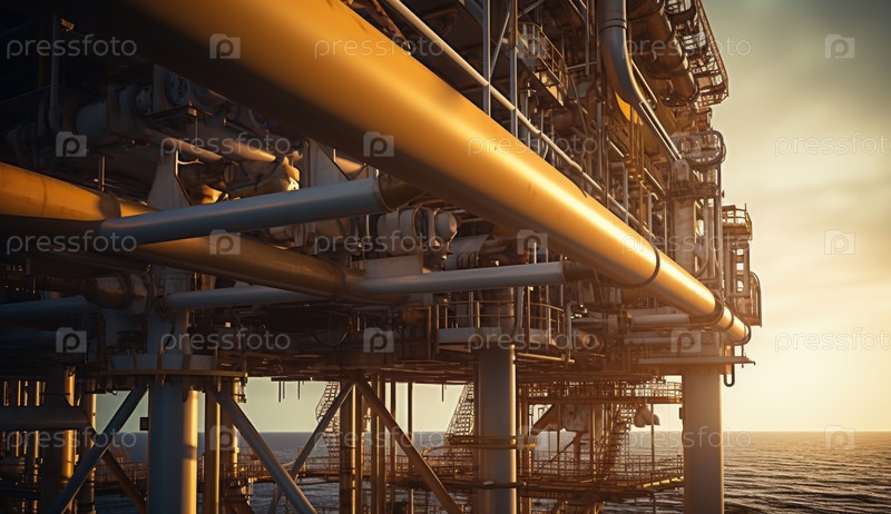 Буровая установка для добычи нефти в океане под закатным небом