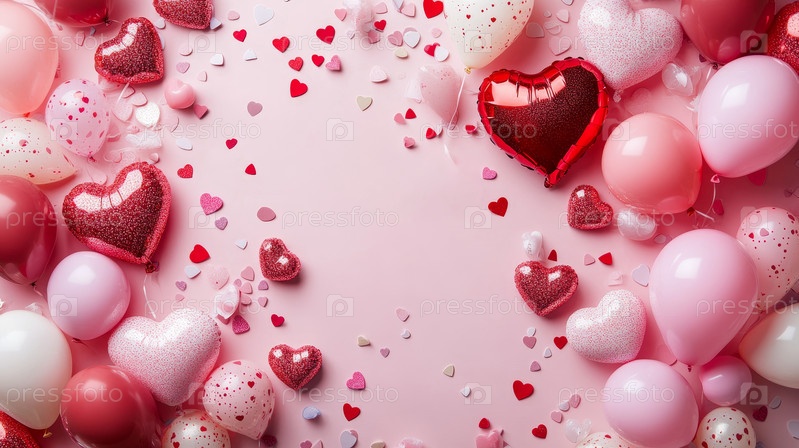 Воздушные шары в форме сердца, парящие среди празднования конфетти