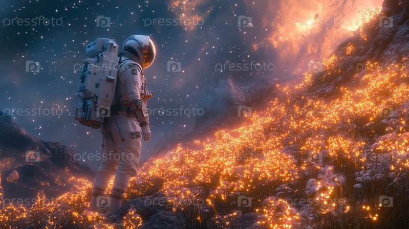 Астронавт на светящейся чужой планете под огненным космическим небом
