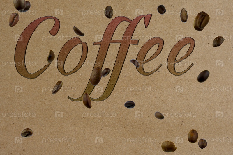 Кофейная типографика с падающими кофейными зернами на фоне крафт-бумаги