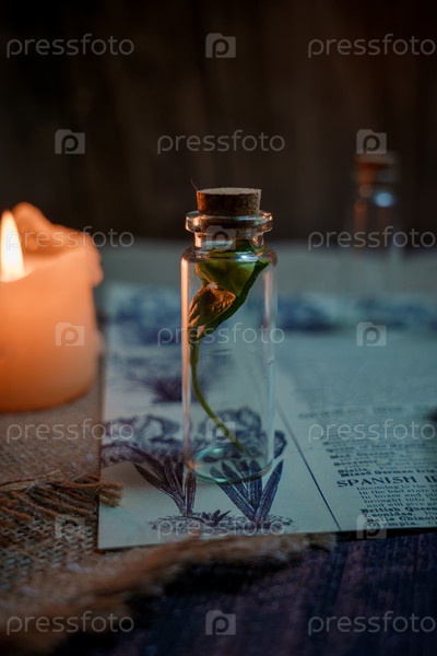 Мистический натюрморт в винтажном стиле с пустыми колбами, горящими свечами, письмами и газетными вырезками