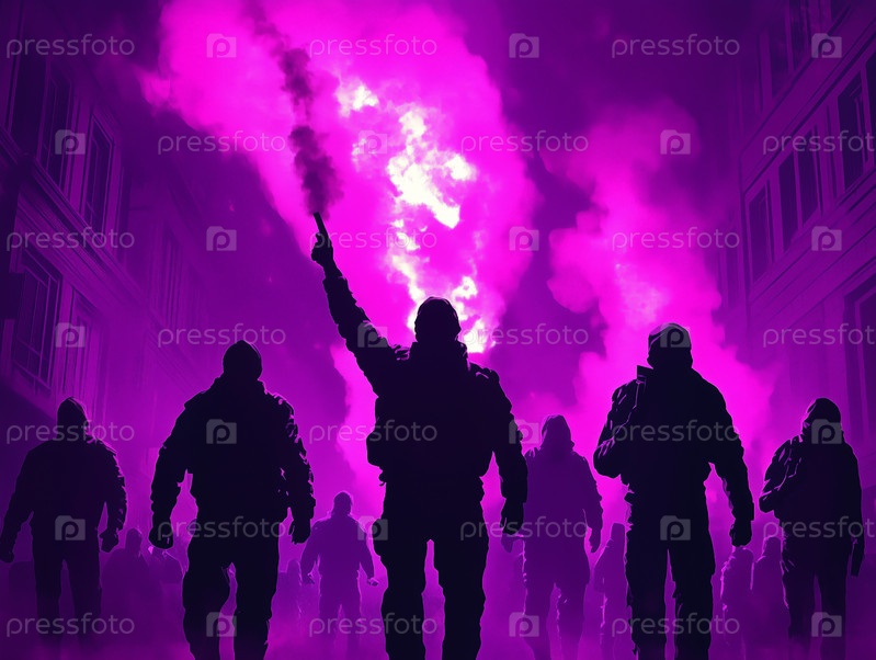 Протестующие маршируют с фиолетовой дымовой шашкой по темной улице