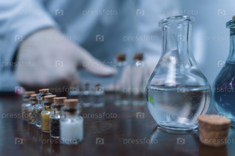 Ученый расставляет пробирки с прозрачными и синими жидкостями