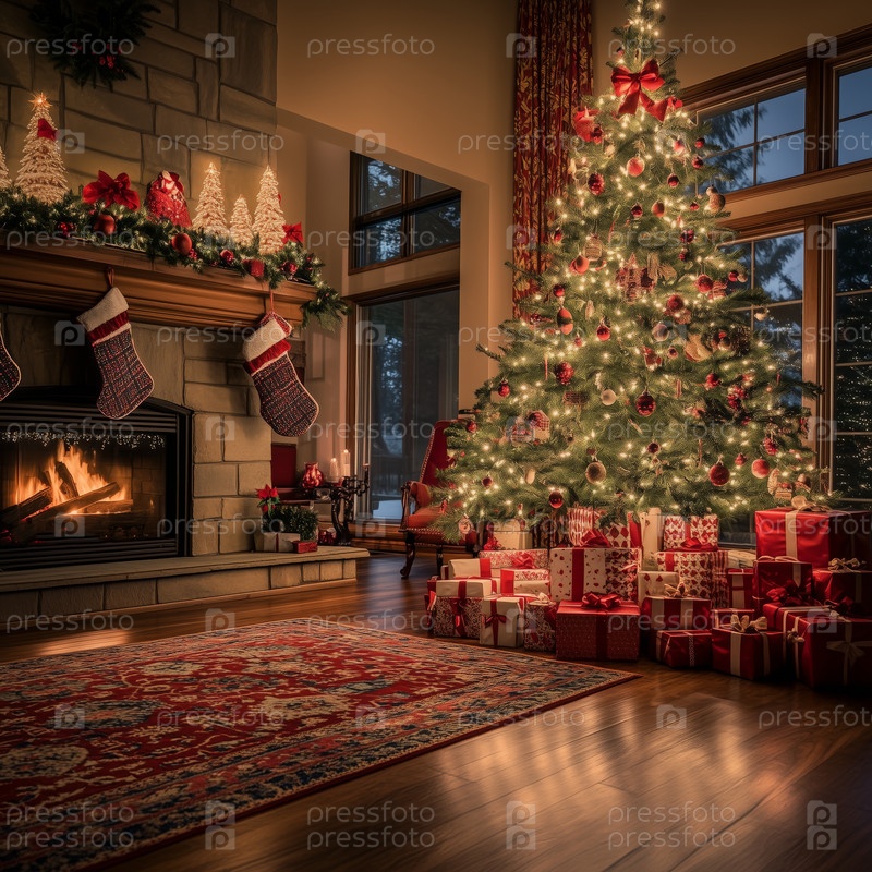 Элегантная гостиная, украшенная к Рождеству камином и елкой