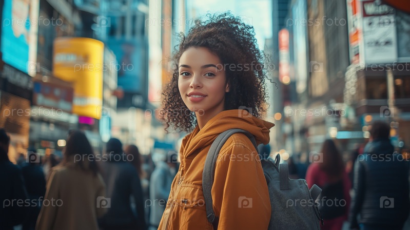 Молодая женщина исследует оживленную городскую улицу