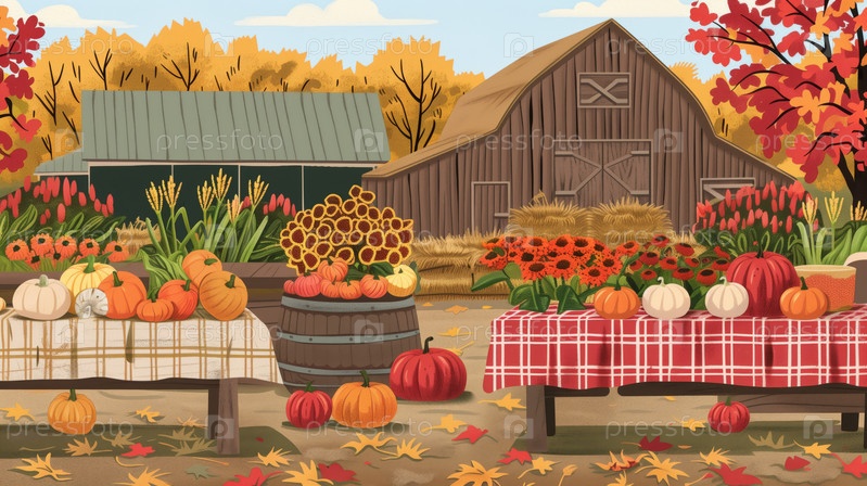 Осенний фермерский рынок с тыквами и продуктами
