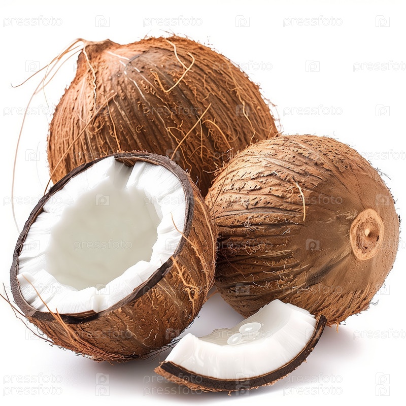 Целые и половинки кокоса на белом фоне