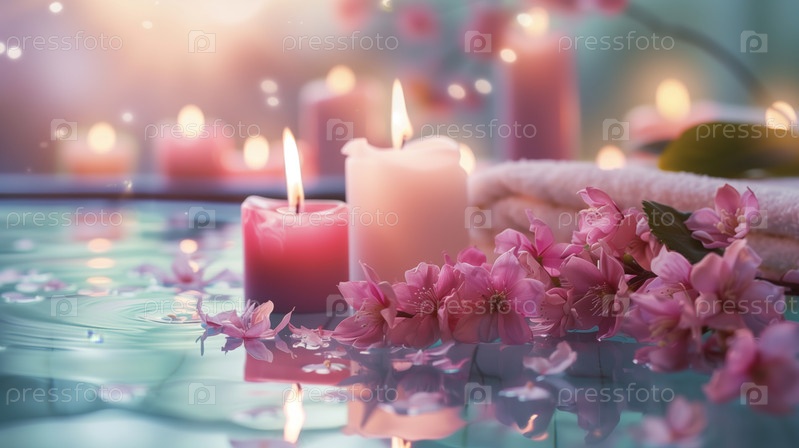 Зажженные свечи и розовые цветы в спокойной обстановке спа-салона