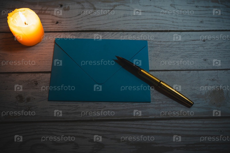 Синий конверт с золотой ручкой в свете свечи