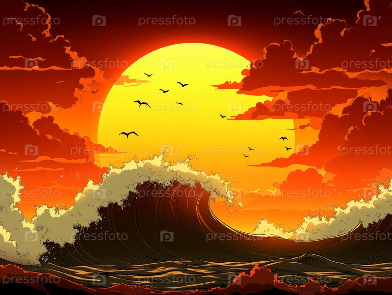 Драматический закат над океанскими волнами с летящими птицами, символизирующий силу природы