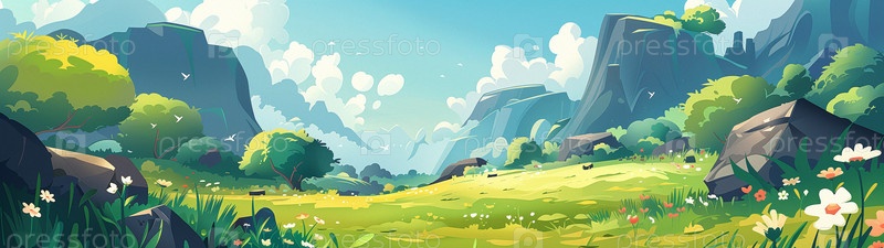 Летняя долина с цветами и деревьями. Панорамный рисунок