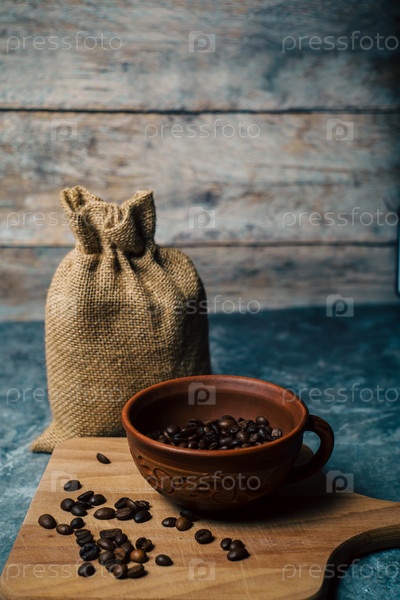 Кофейные зерна в глиняной чашке