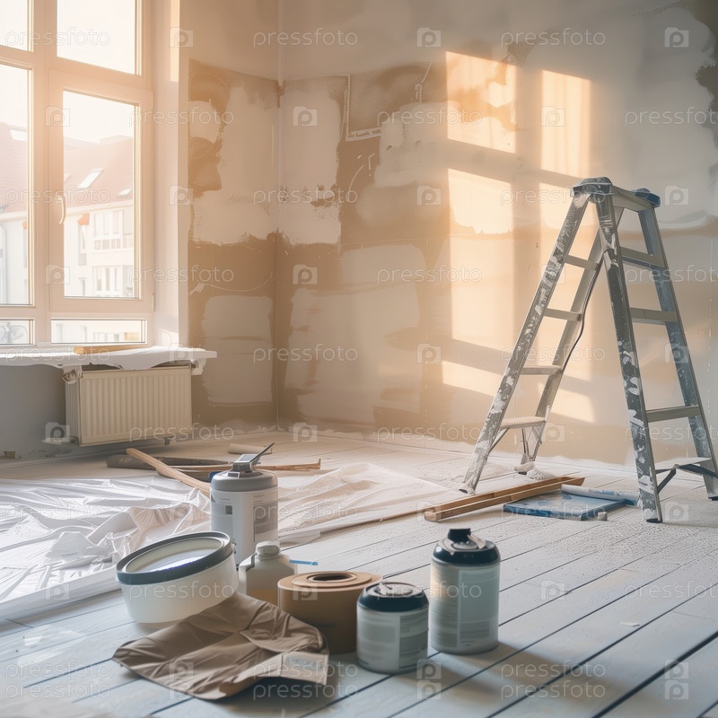 Комната в процессе ремонта с принадлежностями для покраски