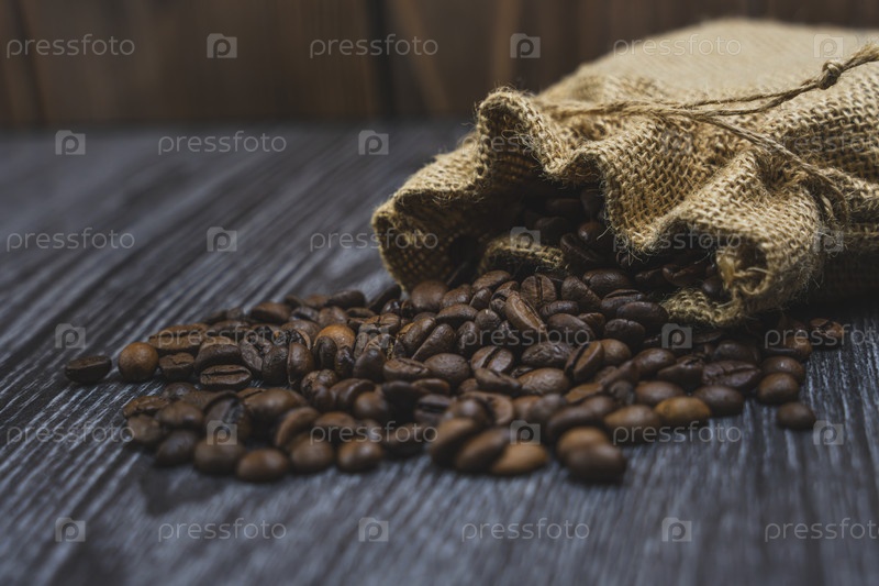Из мешковины высыпаются жареные кофейные зерна на деревянную поверхность