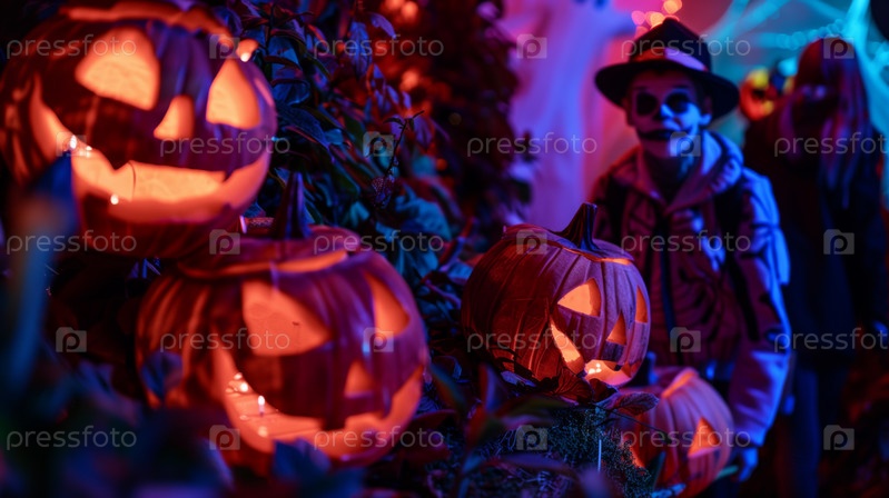 Вечеринка в честь Хэллоуина с людьми в костюмах и украшениями из тыкв