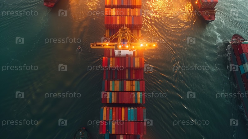 Вид с воздуха на грузовые суда и контейнеры в оживленном порту