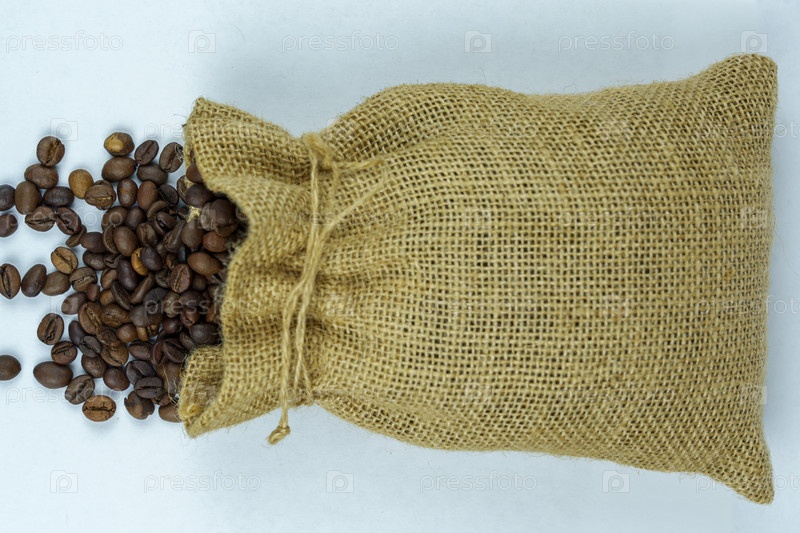 Мешок из мешковины с жареными кофейными зернами, рассыпанными на белом фоне