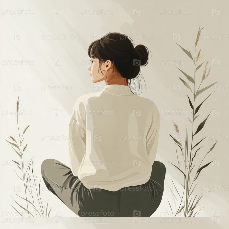 Иллюстрация женщины, мирно сидящей в окружении растений